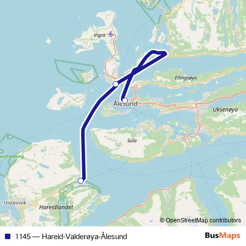 The first stop of the 1145 ferry route is Ålesund hurtigbåtkai Skateflukaia and the last stop is Hareid hurtigbåtkai. 1145 (Hareid-Valderøya-Ålesund) is operational during hver dag.