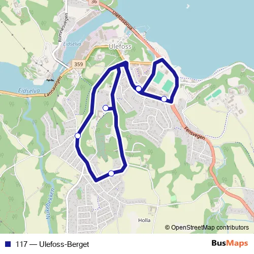 The first stop of the 117 bus route is Ulefoss Senter and the last stop is Ulefoss Senter. 117 (Ulefoss-Berget) is operational during på hverdager.