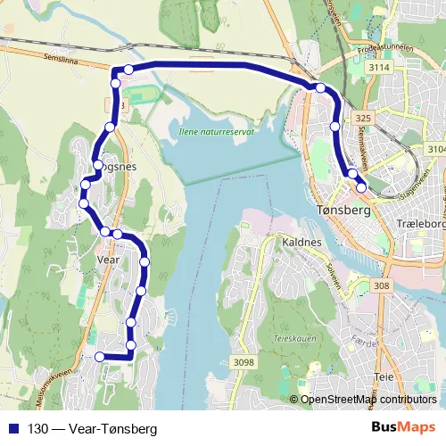The first stop of the 130 bus route is Vearveien and the last stop is Tønsberg rutebilstasjon. 130 (Vear-Tønsberg) is operational during på hverdager.
