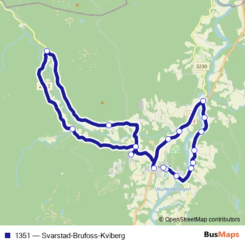 The first stop of the 1351 bus route is Lardal skole and the last stop is Svarstad bussgarasjen. 1351 (Svarstad-Brufoss-Kviberg) is operational during på hverdager.