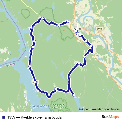 The first stop of the 1359 bus route is Kvelde skole and the last stop is Myre Svartangveien. 1359 (Kvelde skole-Farrisbygda) is operational during på hverdager.