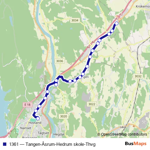 The first stop of the 1361 bus route is Tangen Engane and the last stop is Thor Heyerdahl vgs.. 1361 (Tangen-Åsrum-Hedrum skole-Thvg) is operational during på hverdager.