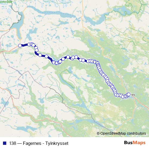 The first stop of the 138 bus route is Tyinkrysset and the last stop is Fagernes skysstasjon. 138 (Fagernes - Tyinkrysset) is operational during hver dag.