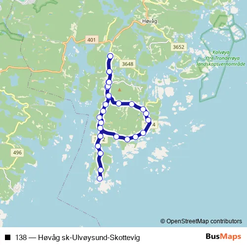 The first stop of the 138 bus route is Høvåg skole and the last stop is Høvåg skole. 138 (Høvåg sk-Ulvøysund-Skottevig) is operational during på hverdager.