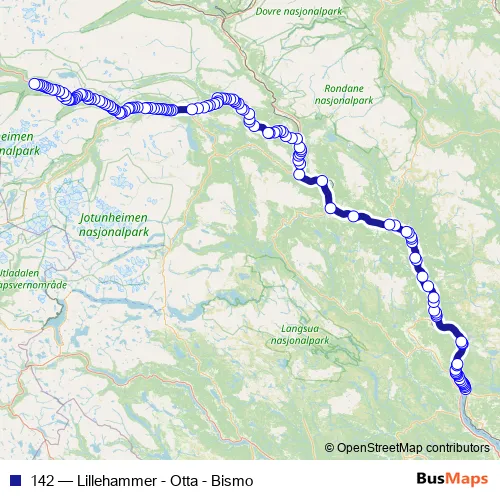 The first stop of the 142 bus route is Lillehammer skysstasjon and the last stop is Bismo. 142 (Lillehammer - Otta - Bismo) is operational during hver dag.