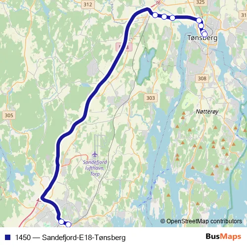 The first stop of the 1450 bus route is Sandefjord rutebilstasjon and the last stop is Tønsberg rutebilstasjon. 1450 (Sandefjord-E18-Tønsberg) is operational during på hverdager.