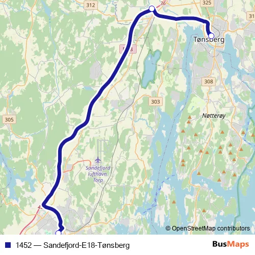 The first stop of the 1452 bus route is Sandefjord vgs. Iii and the last stop is Tønsberg rutebilstasjon. 1452 (Sandefjord-E18-Tønsberg) is operational during på hverdager.