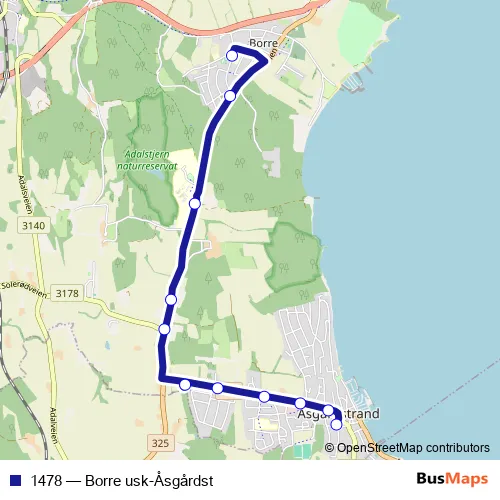 The first stop of the 1478 bus route is Borre ungdomsskole and the last stop is Åsgårdstrand kirke. 1478 (Borre usk-Åsgårdst) is operational during hver dag.
