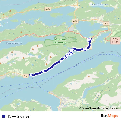 The first stop of the 15 bus route is Valle and the last stop is Magerholm ferjekai. 15 (Glomset) is operational during på hverdager.