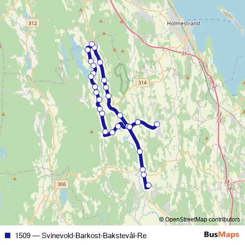 The first stop of the 1509 bus route is Svinevoll and the last stop is Revetal ungdomsskole. 1509 (Svinevold-Barkost-Bakstevål-Re) is operational during på hverdager.