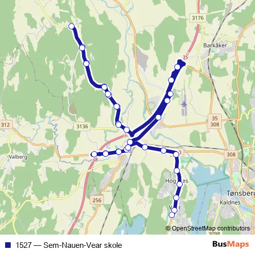 The first stop of the 1527 bus route is Sem Lensberg and the last stop is Vear idrettshall. 1527 (Sem-Nauen-Vear skole) is operational during på hverdager.