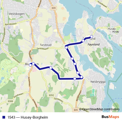 The first stop of the 1543 bus route is Føynland skole and the last stop is Borgheim ungdomsskole. 1543 (Husøy-Borgheim) is operational during på hverdager.