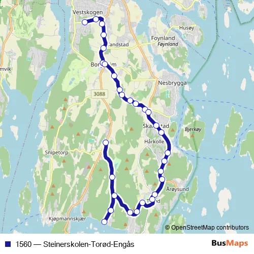 The first stop of the 1560 bus route is Steinerskolen i Vestfold and the last stop is Engås. 1560 (Steinerskolen-Torød-Engås) is operational during på hverdager.