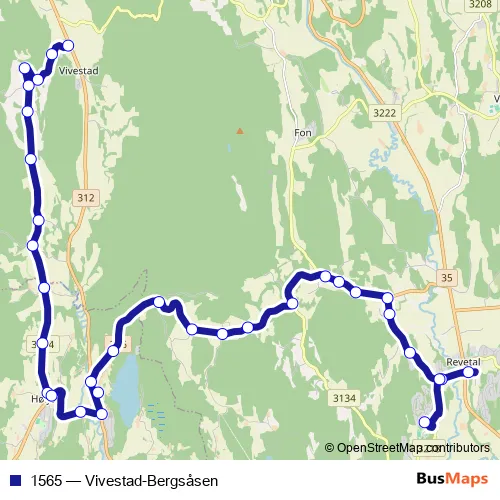 The first stop of the 1565 bus route is Vivestad ungdomslokale and the last stop is Bergsåsen. 1565 (Vivestad-Bergsåsen) is operational during på hverdager.