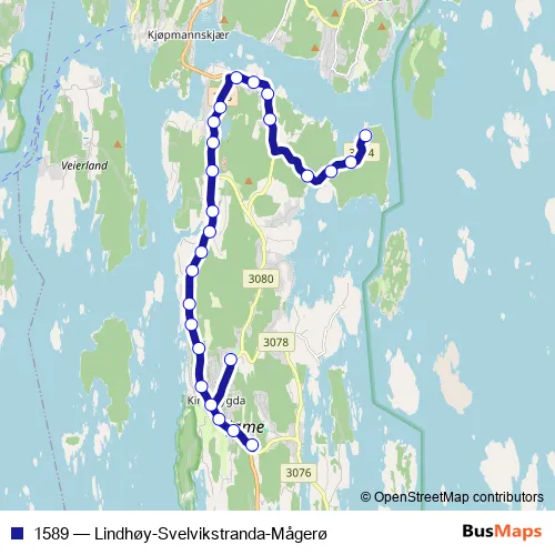 The first stop of the 1589 bus route is Lindhøy skole and the last stop is Mågerø. 1589 (Lindhøy-Svelvikstranda-Mågerø) is operational during hver dag.