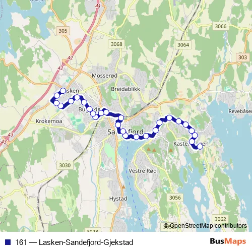 The first stop of the 161 bus route is Busk snuplass and the last stop is Laskenkrysset. 161 (Lasken-Sandefjord-Gjekstad) is operational during hver dag.