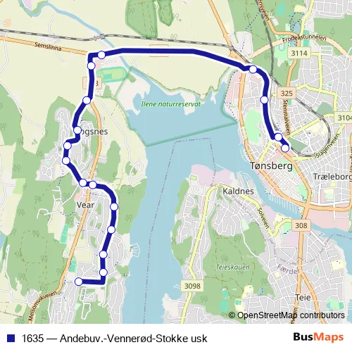 The first stop of the 1635 bus route is Vearveien and the last stop is Tønsberg rutebilstasjon. 1635 (Andebuv.-Vennerød-Stokke usk) is operational during på hverdager.