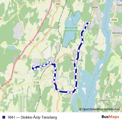The first stop of the 1641 bus route is Bokemoa skole and the last stop is Golfbanen Vear. 1641 (Stokke-Åsly-Tønsberg) is operational during hver dag.