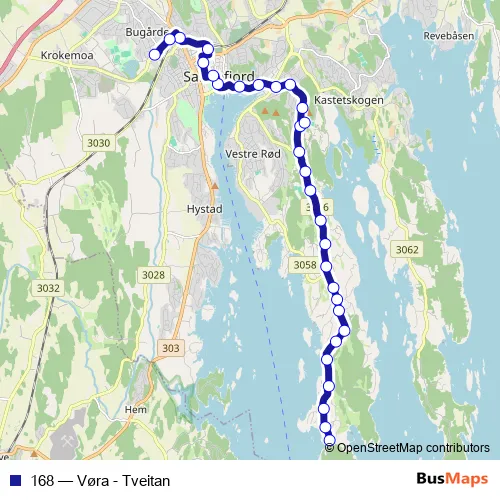The first stop of the 168 bus route is Tveitan and the last stop is Sandefjord vgs.. 168 (Vøra - Tveitan) is operational during på hverdager.