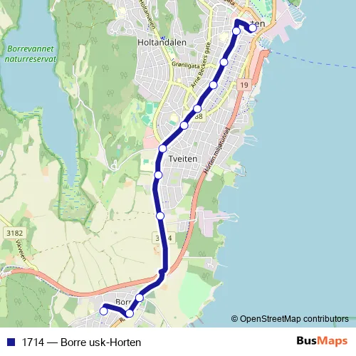 The first stop of the 1714 bus route is Borre ungdomsskole and the last stop is Horten rutebilstasjon. 1714 (Borre usk-Horten) is operational during hver dag.