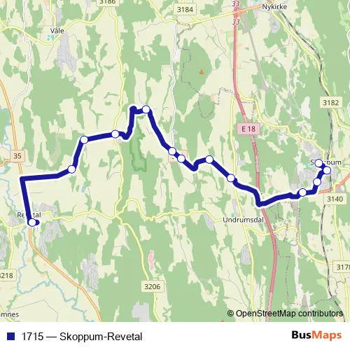 The first stop of the 1715 bus route is Tunet and the last stop is Revetal. 1715 (Skoppum-Revetal) is operational during på hverdager.