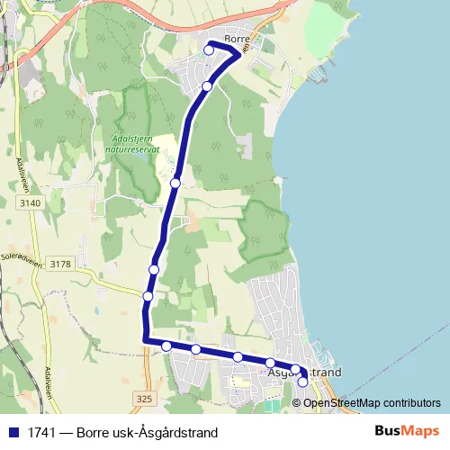 The first stop of the 1741 bus route is Borre ungdomsskole and the last stop is Åsgårdstrand kirke. 1741 (Borre usk-Åsgårdstrand) is operational during hver dag.
