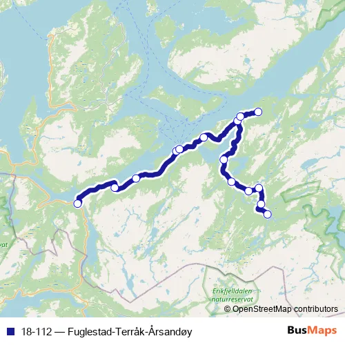 The first stop of the 18-112 bus route is Årsandøy and the last stop is Terråk. 18-112 (Fuglestad-Terråk-Årsandøy) is operational during hver dag.