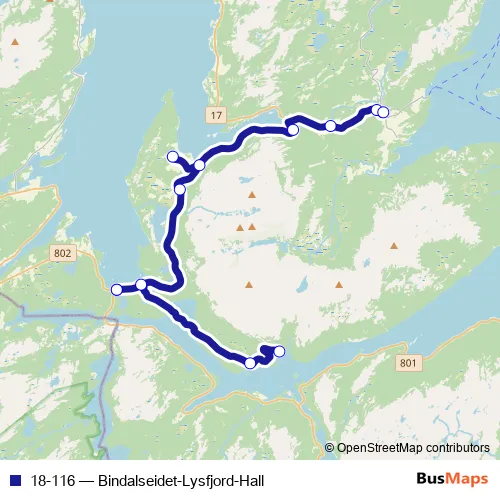The first stop of the 18-116 bus route is Kjelleidet kryss and the last stop is Bindalseidet skole. 18-116 (Bindalseidet-Lysfjord-Hall) is operational during på hverdager.