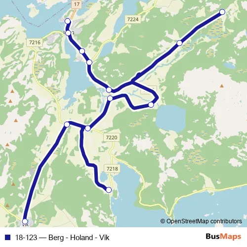 The first stop of the 18-123 bus route is Vik skole and the last stop is Berg skole. 18-123 (Berg - Holand - Vik) is operational during på hverdager.