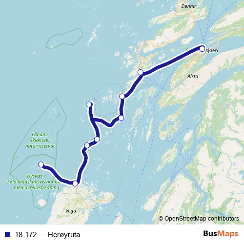 The first stop of the 18-172 ferry route is Sandnessjøen hurtigbåtkai and the last stop is Gardsøya kai Vega. 18-172 (Herøyruta) is operational during hver dag.