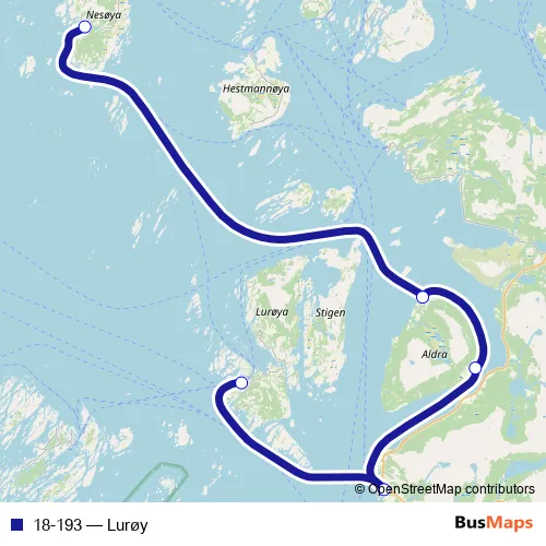 The first stop of the 18-193 ferry route is Onøy hurtigbåtkai and the last stop is Sørnesøy hurtigbåtkai. 18-193 (Lurøy) is operational during hver dag.