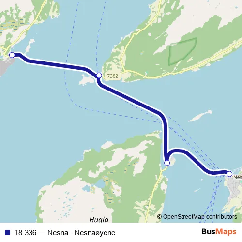 The first stop of the 18-336 ferry route is Nesna ferjekai and the last stop is Tomma ferjekai. 18-336 (Nesna - Nesnaøyene) is operational during hver dag.
