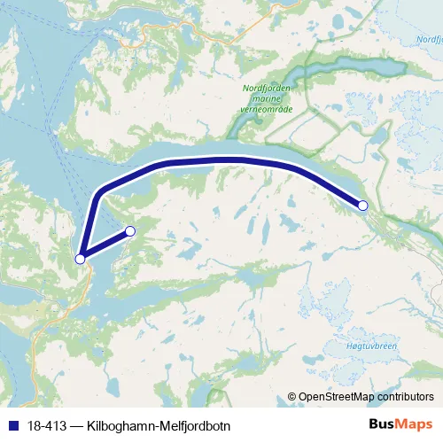 The first stop of the 18-413 ferry route is Melfjordbotn hurtigbåtkai and the last stop is Kilboghamn hurtigbåtkai. 18-413 (Kilboghamn-Melfjordbotn) is operational during hver dag.