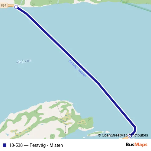 The first stop of the 18-538 ferry route is Festvåg ferjekai and the last stop is Misten ferjekai. 18-538 (Festvåg - Misten) is operational during hver dag.