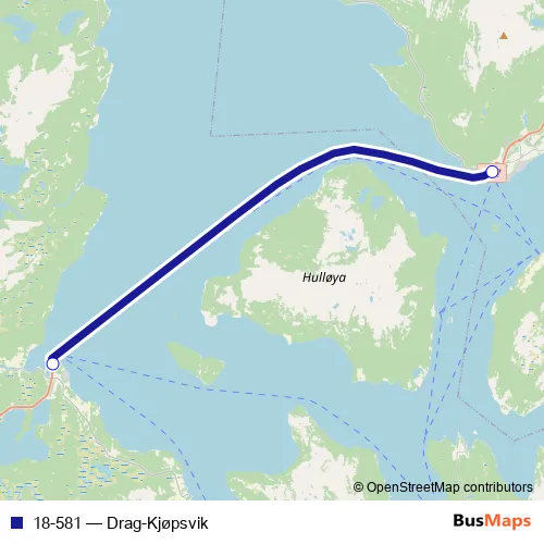 The first stop of the 18-581 ferry route is Kjøpsvik ferjekai and the last stop is Drag ferjekai. 18-581 (Drag-Kjøpsvik) is operational during hver dag.