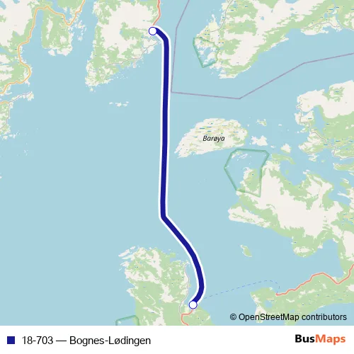 The first stop of the 18-703 ferry route is Bognes ferjekai and the last stop is Lødingen ferjekai. 18-703 (Bognes-Lødingen) is operational during hver dag.