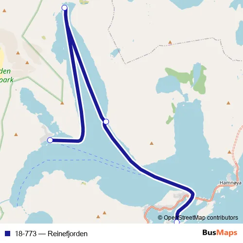 The first stop of the 18-773 ferry route is Reine hurtigbåtkai and the last stop is Vindstad hurtigbåtkai. 18-773 (Reinefjorden) is operational during hver dag.