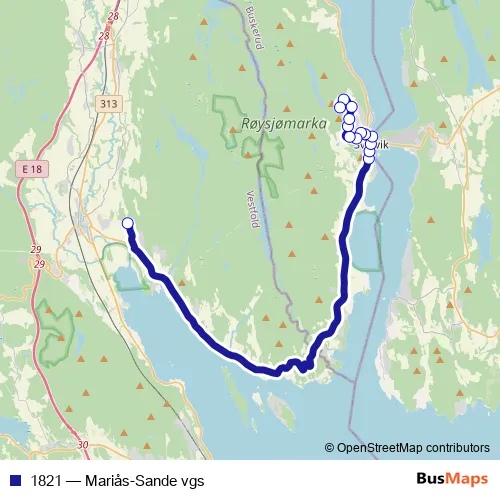 The first stop of the 1821 bus route is Sande vgs. and the last stop is Mariås. 1821 (Mariås-Sande vgs) is operational during på hverdager.