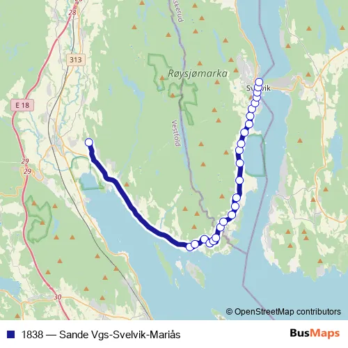 The first stop of the 1838 bus route is Sande vgs. and the last stop is Svelvik ferjekai. 1838 (Sande Vgs-Svelvik-Mariås) is operational during på hverdager.