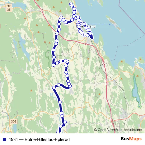 The first stop of the 1931 bus route is Bergsåsen and the last stop is Holmestrand stasjon. 1931 (Botne-Hillestad-Eplerød) is operational during på hverdager.