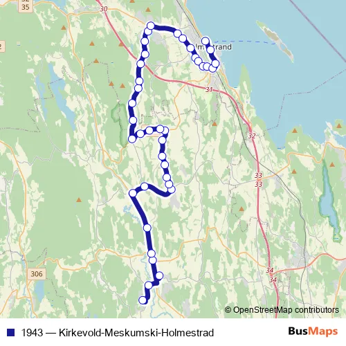 The first stop of the 1943 bus route is Kirkevoll and the last stop is Holmestrand stasjon. 1943 (Kirkevold-Meskumski-Holmestrad) is operational during på hverdager.