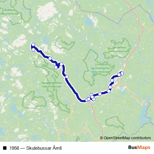 The first stop of the 1956 bus route is Åmli skule and the last stop is Vrålstad indre. 1956 (Skulebussar Åmli) is operational during på hverdager.