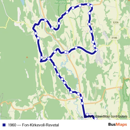 The first stop of the 1960 bus route is Fossan and the last stop is Røråstoppen skole. 1960 (Fon-Kirkevoll-Revetal) is operational during på hverdager.