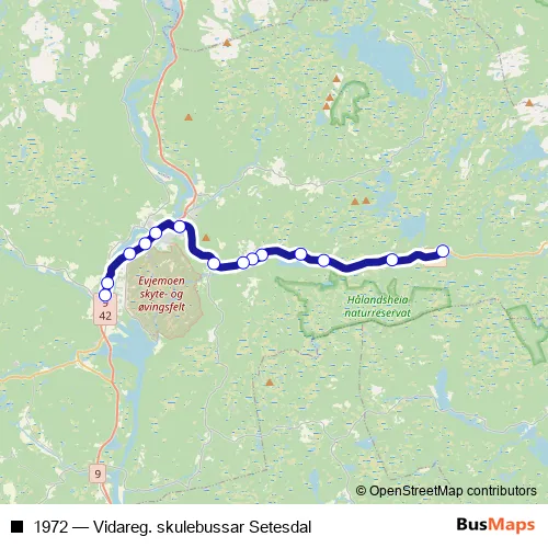 Services on the 1972 - Vidareg. skulebussar Setesdal bus stop at 07:42 on mandag, tirsdag, onsdag, torsdag, fredag.