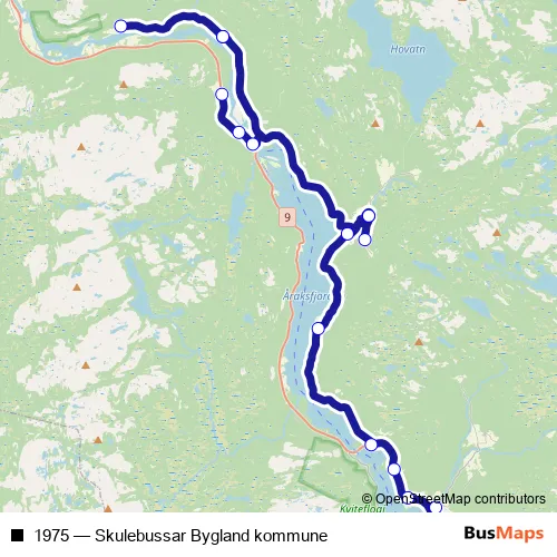 The first stop of the 1975 bus route is Bygland skule and the last stop is Segberg. 1975 (Skulebussar Bygland kommune) is operational during på hverdager.