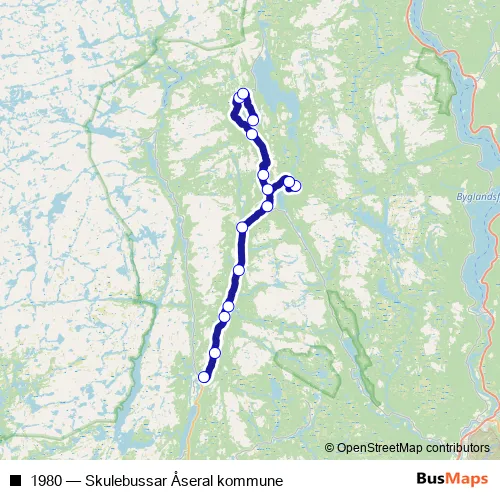 The first stop of the 1980 bus route is Åseral barne- og ungdomsskule and the last stop is Utsikten. 1980 (Skulebussar Åseral kommune) is operational during på hverdager.