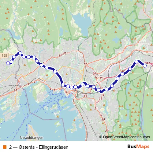 The first stop of the 2 metro route is Østerås and the last stop is Ellingsrudåsen. 2 (Østerås - Ellingsrudåsen) is operational during hver dag.