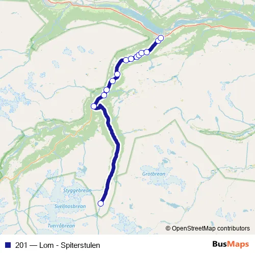 The first stop of the 201 bus route is Spiterstulen and the last stop is Lom sentrum. 201 (Lom - Spiterstulen) is operational during hver dag.