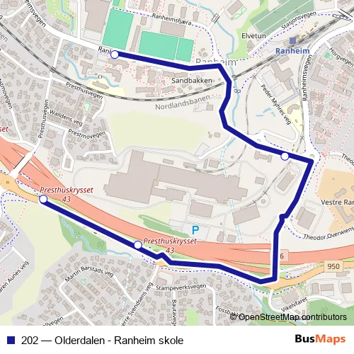 The first stop of the 202 bus route is Ranheim idrettsplass and the last stop is Presthus. 202 (Olderdalen - Ranheim skole) is operational during på hverdager.