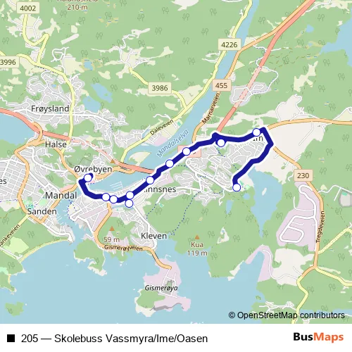 The first stop of the 205 bus route is Harkmark snuplass and the last stop is Mandal sentrum. 205 (Skolebuss Vassmyra/Ime/Oasen) is operational during på hverdager.